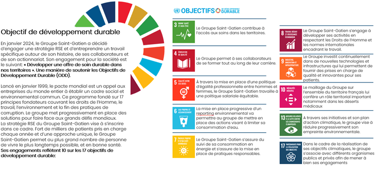 Afin de cadrer notre démarche, le groupe Saint-Gatien, 1er acteur familial de la santé, a défini sa raison d’être. Cette raison d’être cherche à développer une vision de long-terme afin d’accompagner les femmes et hommes du groupe dans leur mission : « Développer une offre de Santé durable dans nos territoires ».